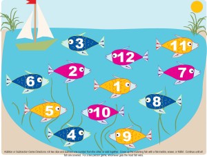 The fish in the pond game is a simple addition or subtraction game. Roll 2 dice, add or subtract the numbers, and use a counter to cover up the fish with the correct number. The person with the most fish wins.