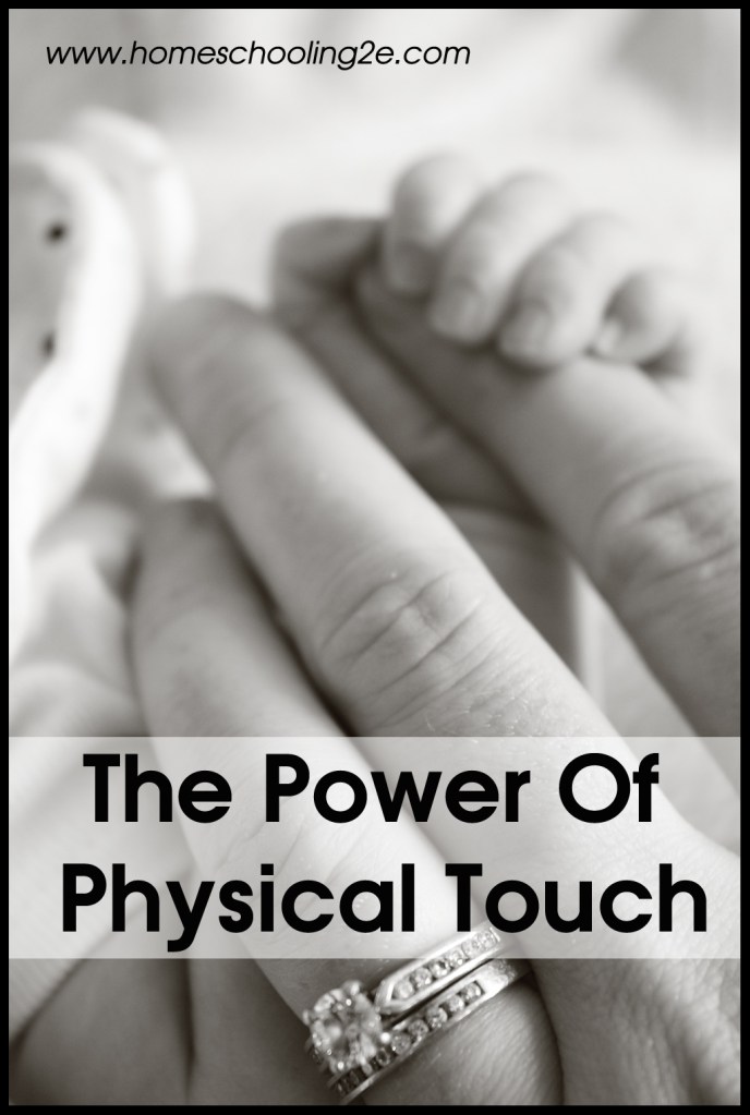 Physical contact is the one thing that calms them down, especially my sensory seekers. If the Engineer is starting to lose it, I’ll pull him up to me in a giant hug with full body contact. I’ll put my hand on his shoulder to get his attention. Those times when he literally cannot hear me, one little physical touch is enough to break him out of his concentration and get his attention. It works.